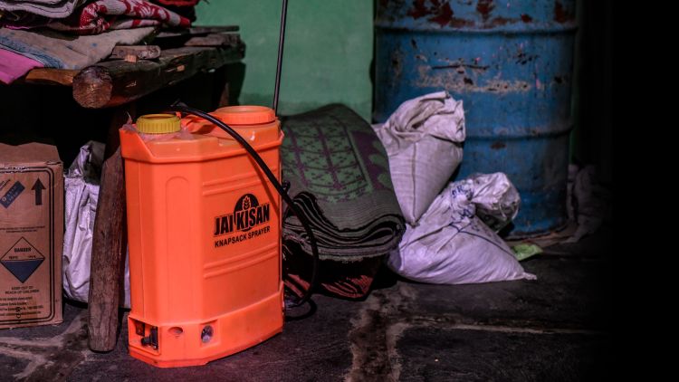 Once the pesticides have been used, the containers they were sold in are recycled for other purposes. They’re often used for transporting drinking or washing water. We see children using pesticide containers with red warning triangles to wash themselves in the open air. We see containers used for toxic pesticides hanging on latrine doorways and in kitchens. They’re everywhere.