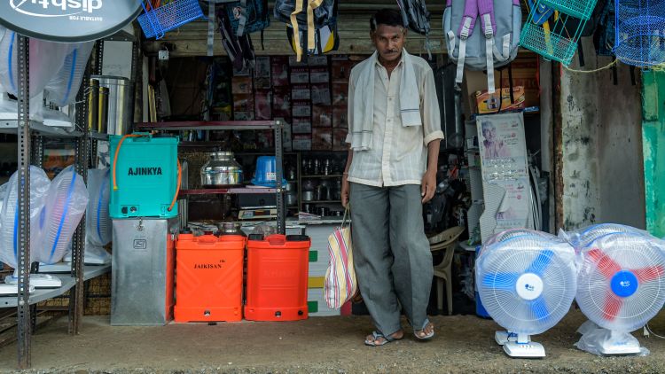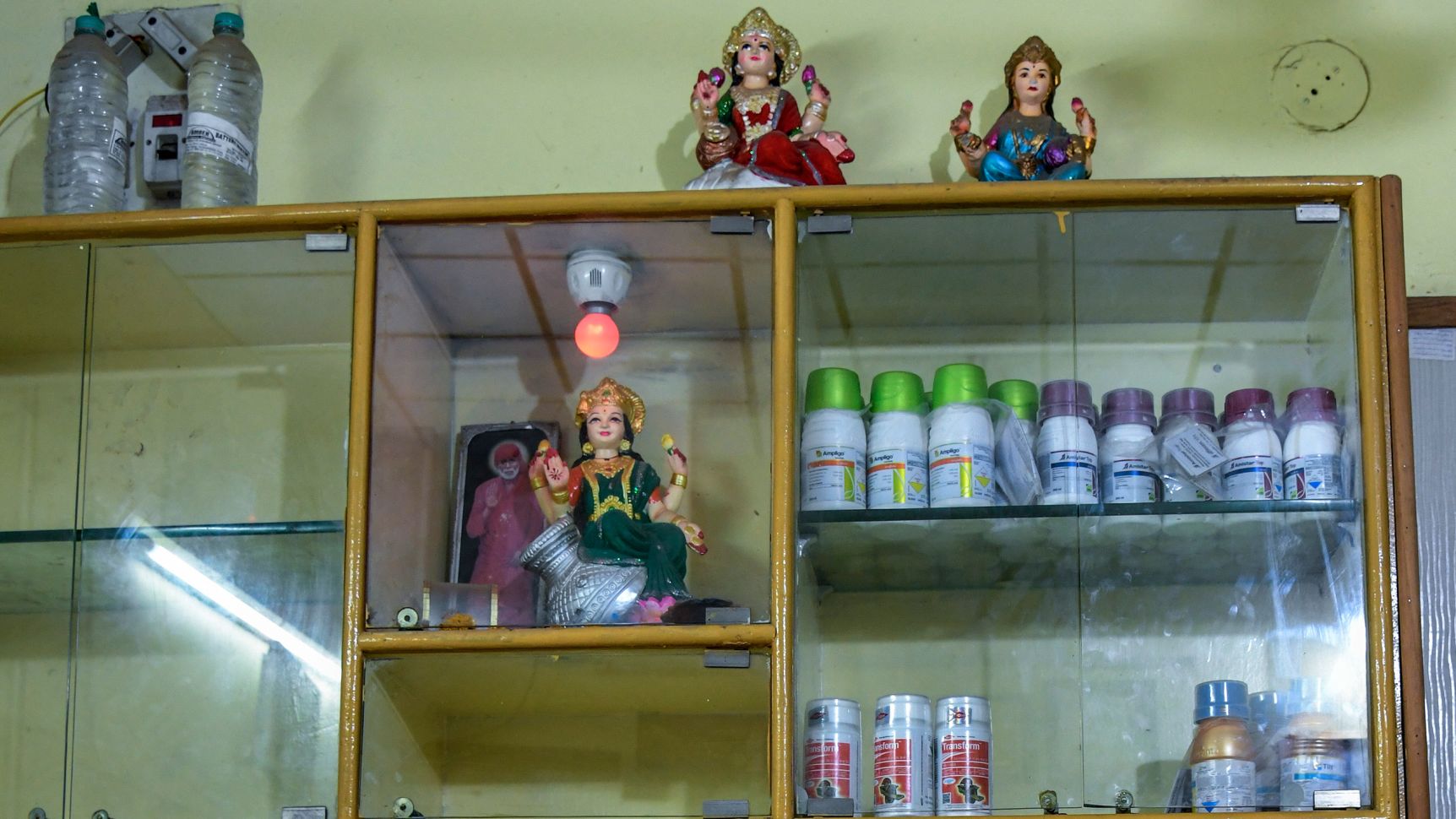 We wanted to see how this works in practice – so we hunted for the shop in Ghatanji where Purushottam Khadse bought his Polo. It’s in the next street. There are three Syngenta products stocked next to each other on a shelf: the fungicides Amistar Top and Tilt, as well as the insecticide Ampgligo, which has a yellow warning triangle printed on it stating that the product is “highly toxic”. Next to them are three statues of the goddess Lakshmi who embodies luck, beauty and – last but not least – prosperity.