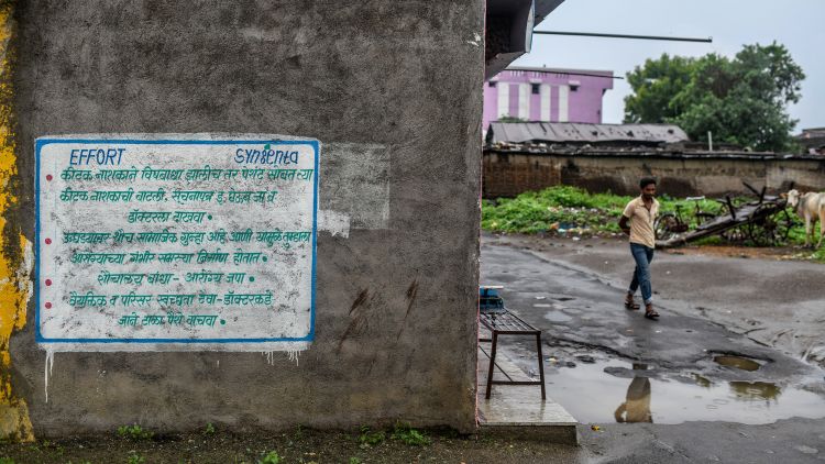 He still has some left over though; he opens a small hatch in the hall of his house and pulls an unopened white sack out of a plastic bag. The word “Danger” is written on a blue warning triangle – blue means “poisonous”. There is a warning printed on the triangle: “Avoid inhalation and contact with eyes. Wear protective clothing, mask, goggles and boots while spraying. In case of any sign of poisoning, immediately consult the doctor.” And then: “No specific antidote is known. Apply symptomatic therapy.” Yet all of this information is written in English and Hindi. Not a single word is written in Marathi, the only language that most people here speak.